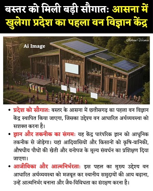 - छत्तीसगढ का पहला वन विज्ञान केंद्र आसना में स्थित आसना पार्क में स्थापित किया जाएगा।