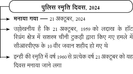 पुलिस स्मृति दिवस November 11, 2024November 11, 2024 प्रश्न – हाल ही में ‘पुलिस स्मृति दिवस’ कब मनाया गया?(a) 15 अक्टूबर (b) 21 अक्टूबर(c) 14 अक्टूबर (d) 10 अक्टूबरउत्तर – (b)संबंधित तथ्य – लेखक -विवेक त्रिपाठी संबंधित लिंक भी देखें… https://www.business-standard.com/india-news/police-commemoration-day-2024-history-significance-and-other-details-nc-124102100299_1.html https://www.livemint.com/news/trends/police-commemoration-day-on-october-21-why-is-it-observed-today-know-the-history-importance-and-other-details-11729483209027.html https://www.aninews.in/videos/national/police-commemoration-day-2024-home-minister-amit-shah-pays-tribute-at-national-police-memorial/