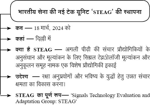 - भविष्य के युद्धों के लिए तैयार होने हेतु भारतीय सेना ने अपनी तरह का पहला सिग्नल टेक्नोलॉजी इवैल्यूएशन एंड एडाप्टेशन ग्रुप (STEAG) स्थापित किया है।