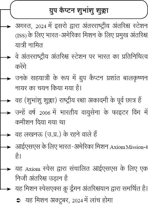 प्रश्न – हाल ही में कौन अंतरराष्ट्रीय अंतरिक्ष स्टेशन (ISS) भारत-अमेरिका मिशन के लिए प्रमुख अंतरिक्ष यात्री नामित किया गया?