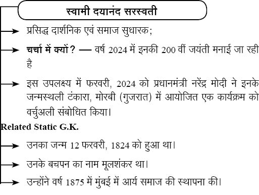 - 11 फरवरी‚ 2024 को प्रधानमंत्री नरेंद्र मोदी ने वर्चुअली प्रसिद्ध दार्शनिक एवं समाज सुधारक स्वामी दयानंद सरस्वती की 200वीं जयंती के उपलक्ष्य में उनकी जन्मस्थली टंकारा‚ मोरबी (गुजरात) में आयोजित एक कार्यक्रम को संबोधित किया।